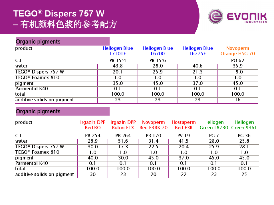 > > > TEGO 757  有機(jī)顏料參考配方 <