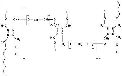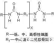 疏水改性聚醚增稠劑(HMPE)疏水改性聚醚增稠劑的性能與HEUR相似,產(chǎn)品有Hercules的Aquaflow NLS200、NLS210和NHS300。改性聚脲增稠劑是BYK公司開發(fā)的增稠劑,其結(jié)構(gòu)如圖4所示。它的增稠機理是既有氫鍵的作用,也有端基的締合作用。與一般增稠劑比較,它的防沉降和抗流掛性能好。根據(jù)端基的不同極性,改性聚脲增稠劑可分為三種:低極性聚脲增稠劑、中極性聚脲增稠劑和高極性聚脲增稠劑。前二種用于溶劑型涂料增稠,而高極性聚脲增稠劑既可用于高極性溶劑型涂料中,也可用于水性涂料增稠。低極性、中極性和高極性聚脲增稠劑的商品分別如BYK-411、BYK-410和BYK-420。