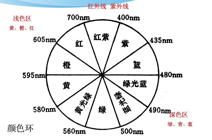 所謂物體的顏色就是對可見光選擇吸收的結(jié)果。不過我們感覺到的顏色,不是吸收光波長的光譜色,是反射光的顏色,反射光的光譜色,是反射光作用于人眼視覺而造成的。就是被吸收光的補色。