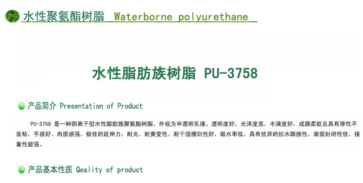- 為供應(yīng)打印油墨及皮革面漆類客戶,三升推出水性聚氨酯樹脂PU-3339,此款樹脂表面絲滑,中軟,耐失光;耐水優(yōu)異,沸水澆淋,不發(fā)白,不起泡;斷裂伸長率為300-450%;穩(wěn)定性好,耐磨性能優(yōu)異