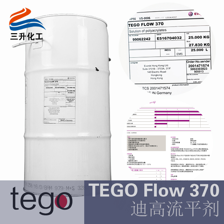 以下為三升貿易暢銷產品,贏創(chuàng)德固賽迪高助劑流平劑的TEGO Flow 370流平劑 ,TEGO Flow 370流平劑非常適用于薄膜類涂料表面,優(yōu)異的耐高溫熱穩(wěn)定性,能夠達到220℃。